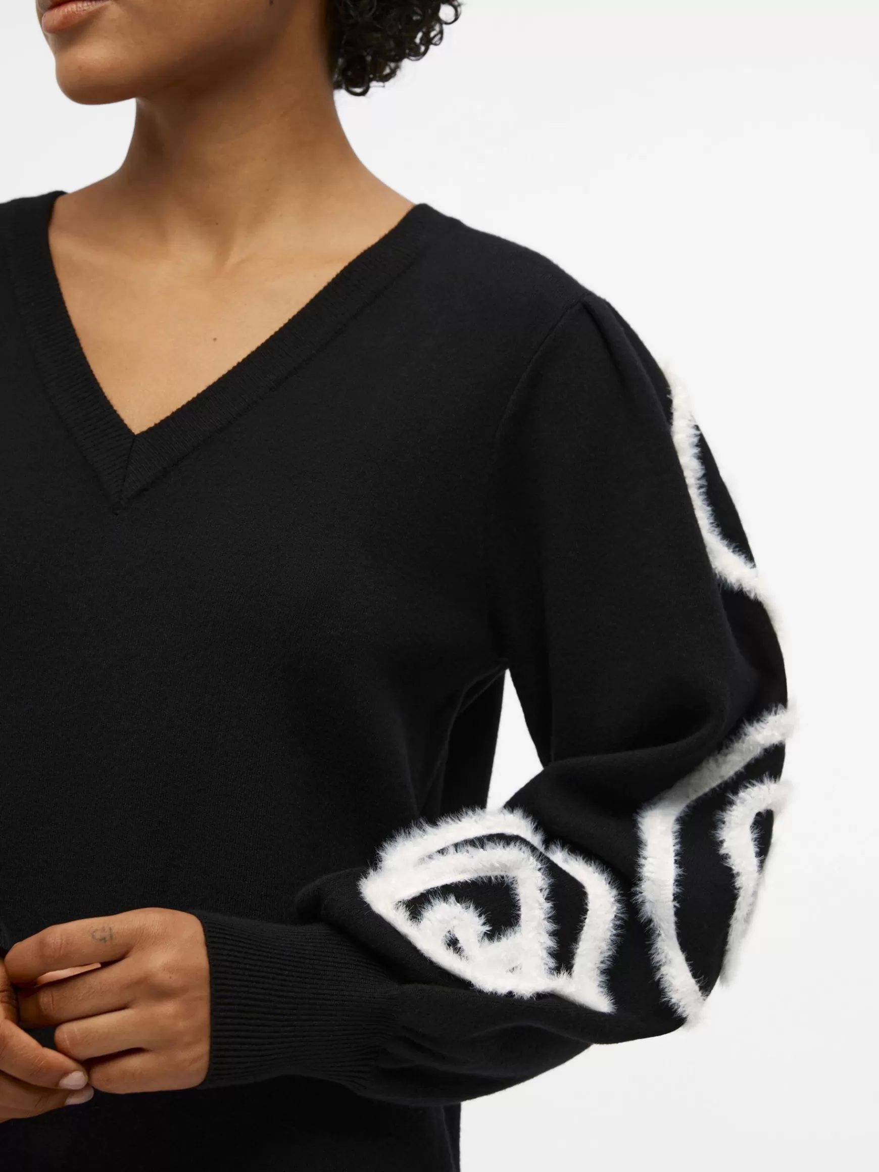– Strikket kjole i minilængde – V-hals- Ballonærmer med fluffy broderet detalje- Tætsiddende ærmekanter- Relaxed fit- Fremstillet med mere ansvarligt stof