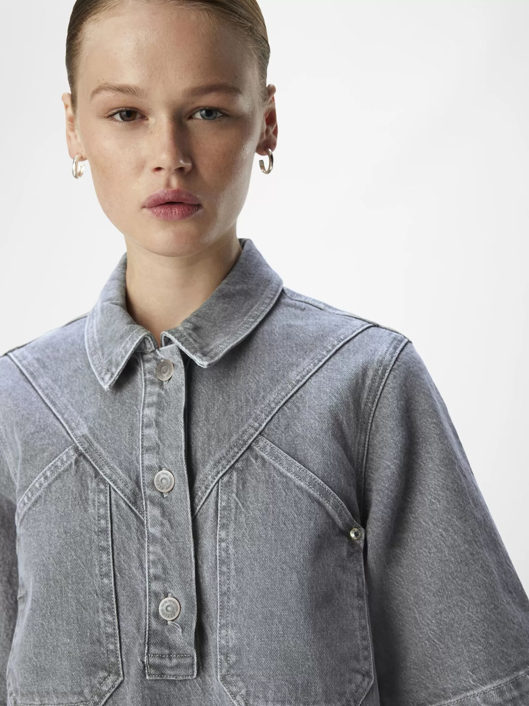 – Denimkjole i mini-længde- Spread-krave- Korte ærmer- Knapstolpe med 3 knapper- Nederdel i A-form- Almindelig pasform