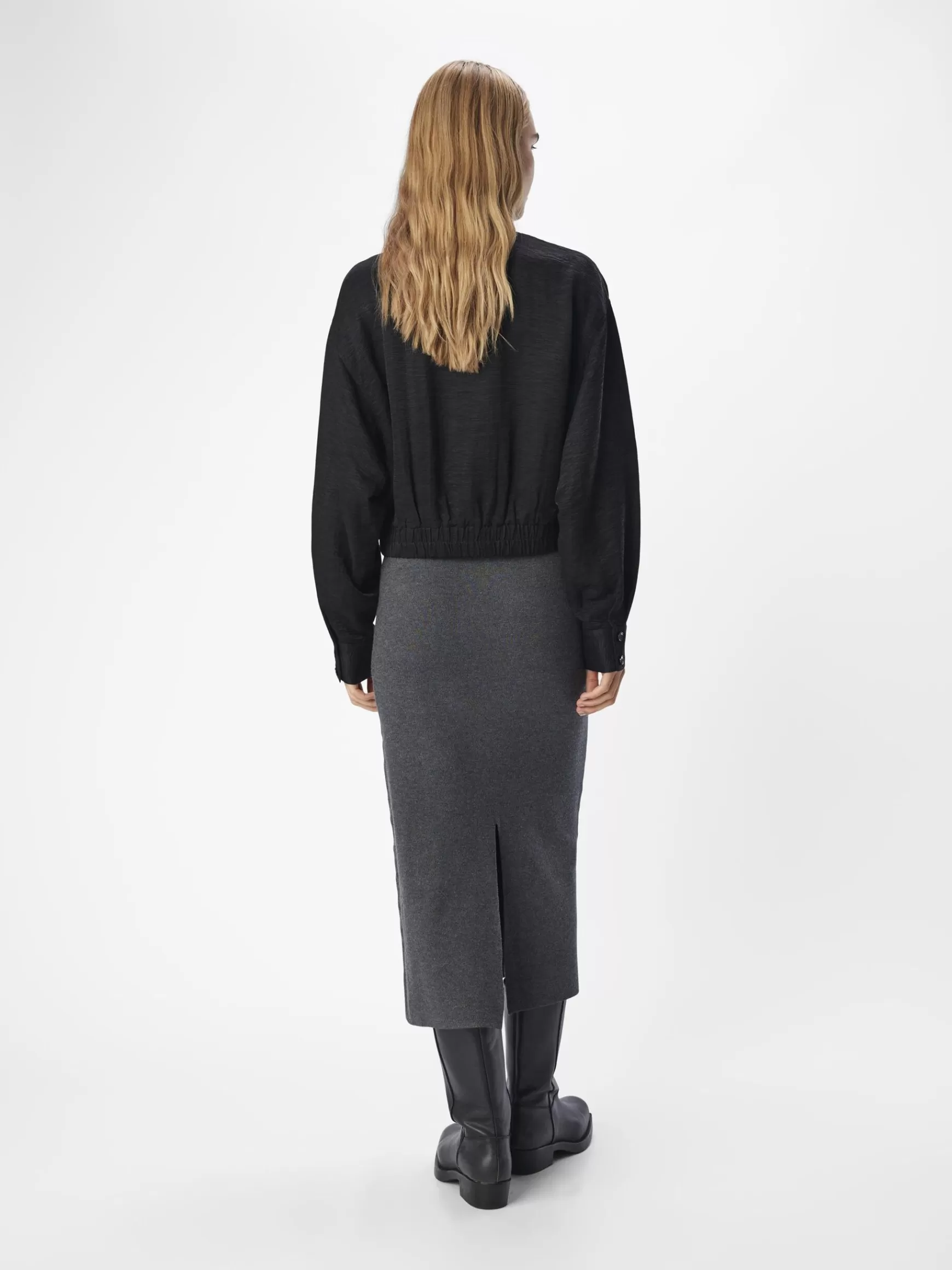 – Let bomberjakke- Baseball-krave- Lange ærmer- Knapper foran skjult af stolpe- Brystlommer- Kant med elastik- Almindel…