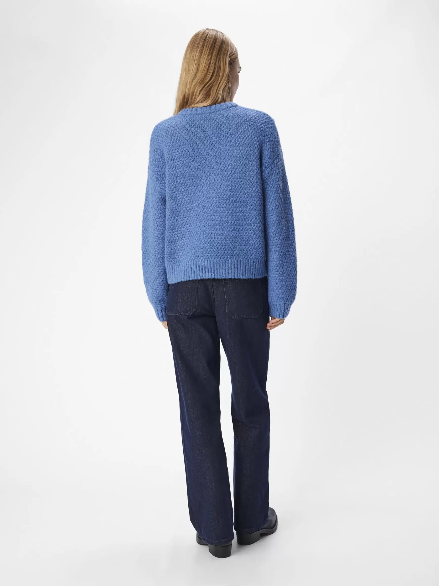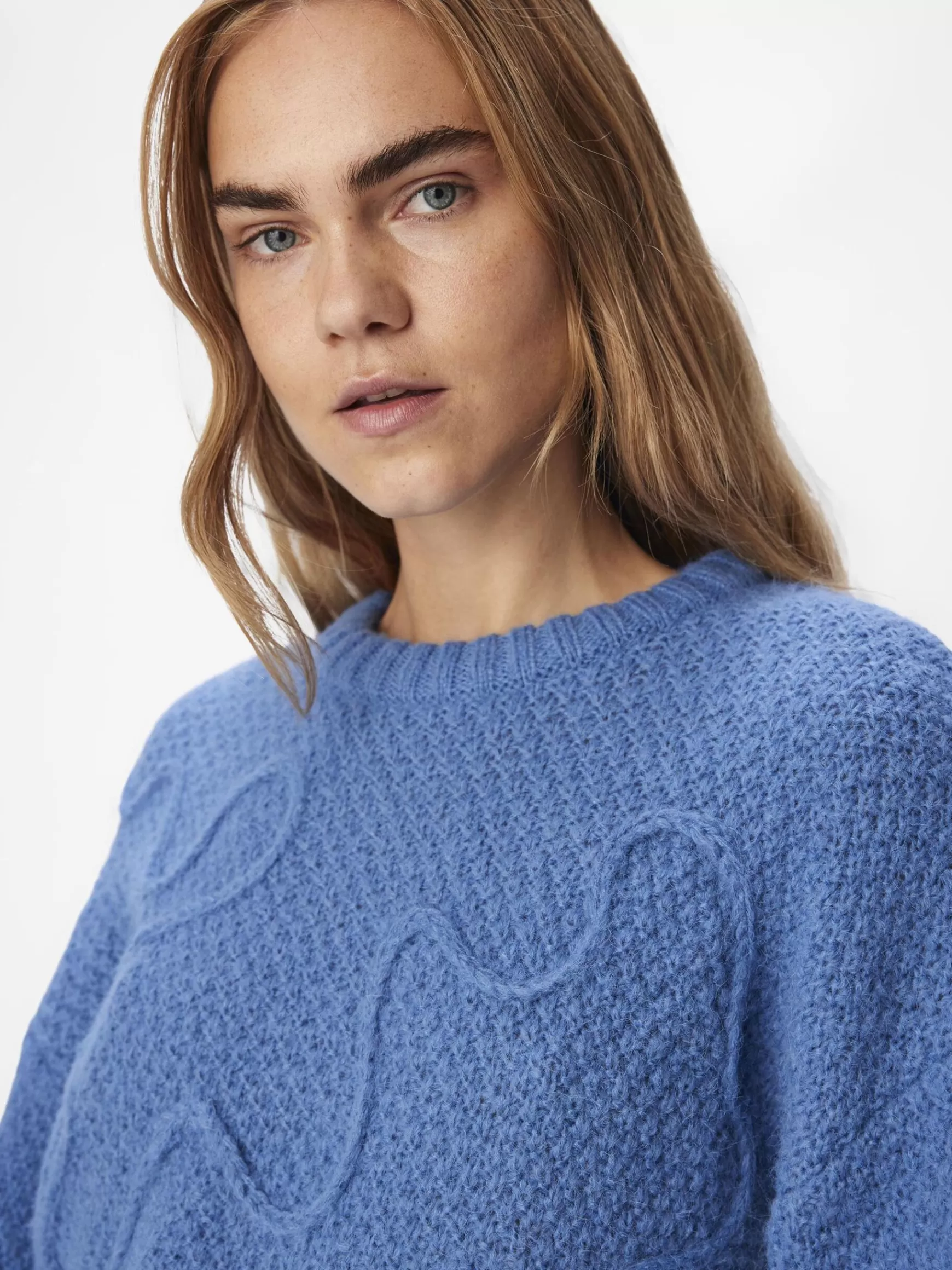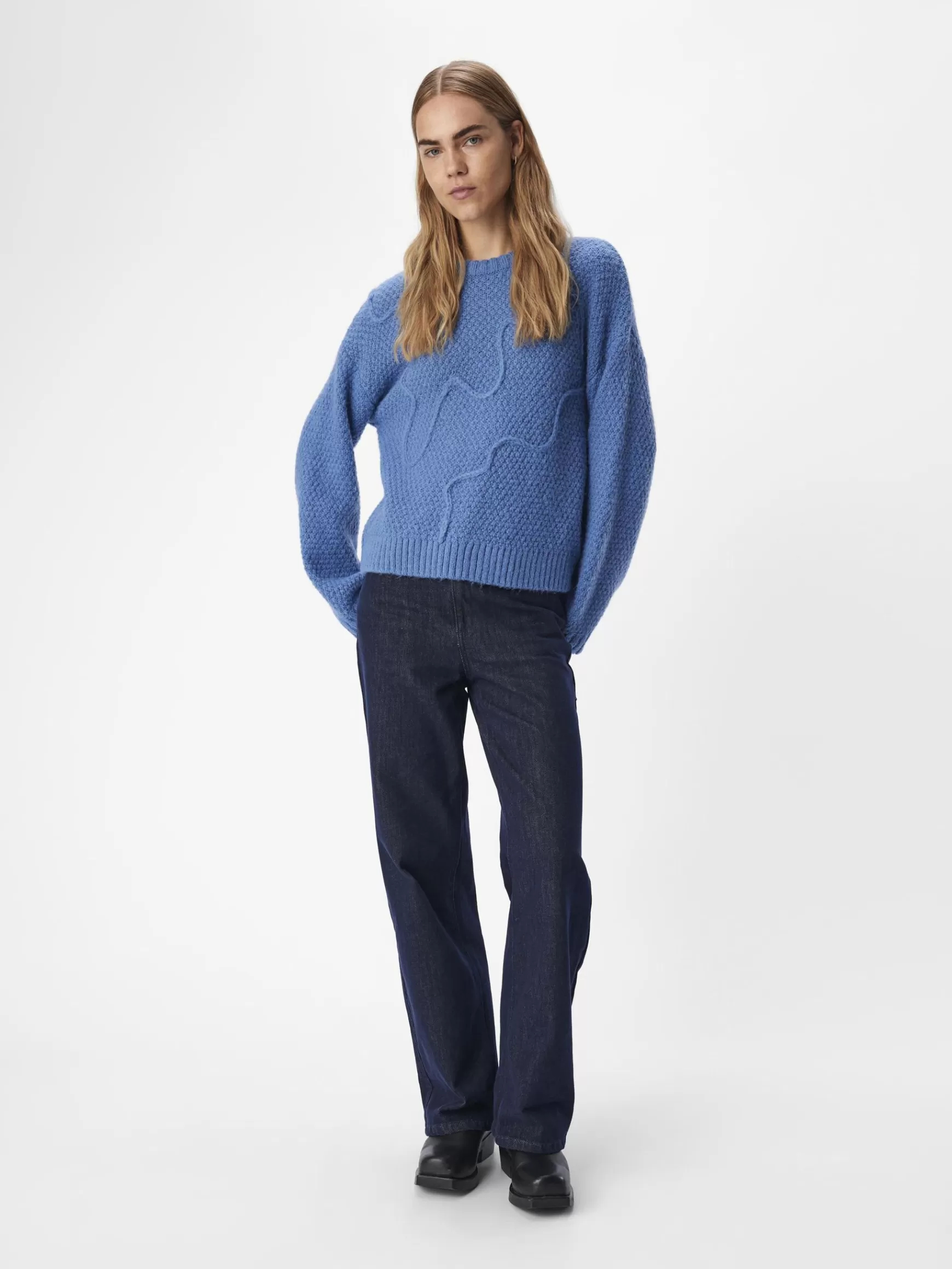 – Strikket trøje med chunky detalje- Rund halsudskæring- Sænkede skuldre- Lange ærmer- Tætsiddende ærmekanter- Ribbede kanter- Regular fit